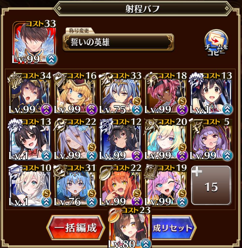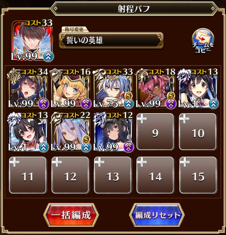 一番バフ盛りしやすい遠距離ユニットを対象として、編成バフ枠射程スキルバフ枠→自己バフ枠と順番にバフを掛けていく。なお、戦神の加護は調べるのがちょー面倒くさかったのですべてOFFとした。所持バフは有り。