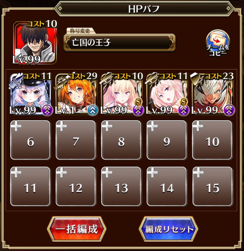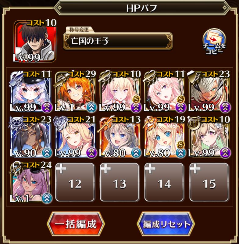 編成から外せない王子は、計算が簡単になるようにHPバフの無い称号にした。