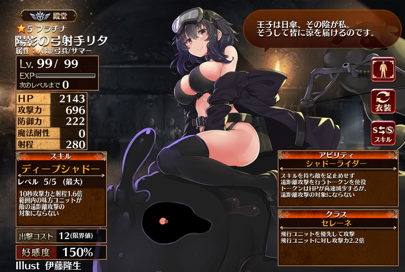 500円課金で貰える黒ソーマも「弓兵属性の遠距離系ユニットの射程+15」を持っていたので、アデライド+スーと競合するかチェックしておく。