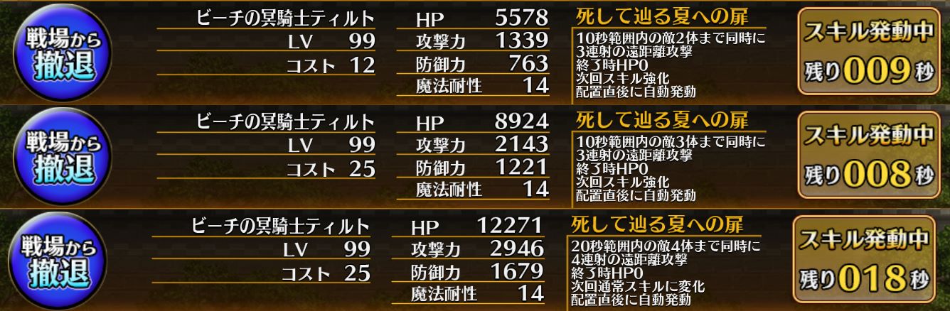 ※オルクスパラティヌス分岐の場合は「再出撃する度にHP/攻撃/防御が55%上昇、さらに魔法耐性が20上昇(2回まで)」(SS撮り忘れ)