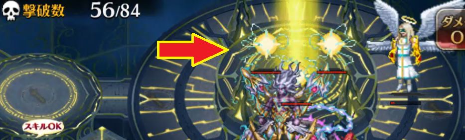 撃破数56あたりで出現するカミナリ玉を合図にステージギミックが発動します。指定地点に配置されているユニットが大ダメージを受けてしまうため、それを見越したユニット配置が必要になります。