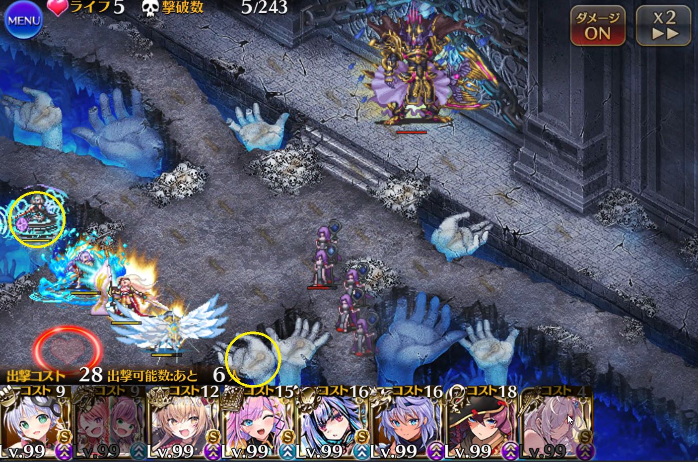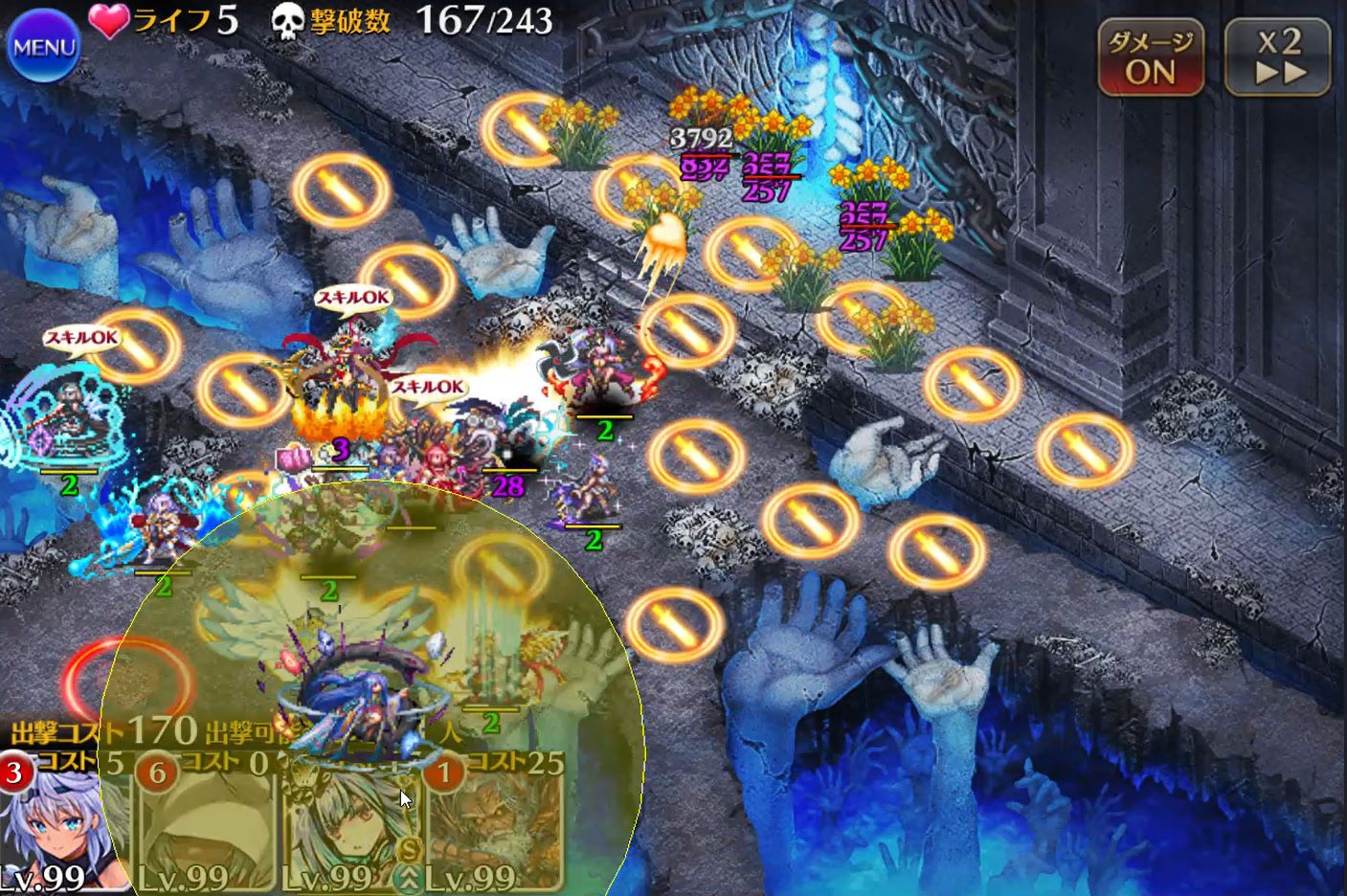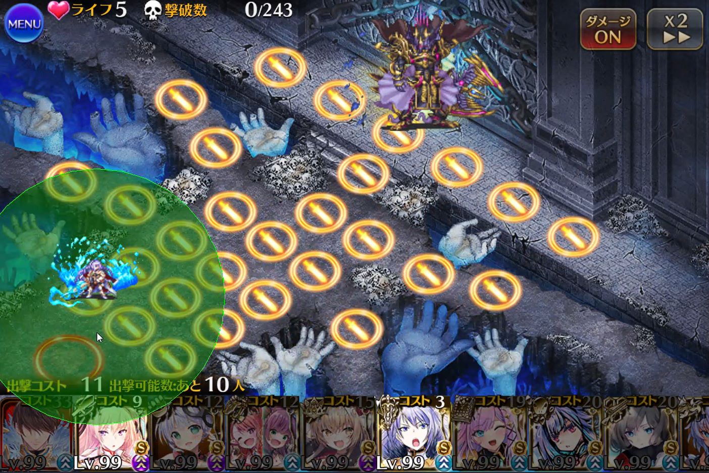 ハイドースを倒した段階で既に布陣は完成しているはずなので、ペルセフォネはそのまま流れでいけそう。さっさとブロックしないと遠距離の範囲攻撃が飛んでる来る点には要注意です。