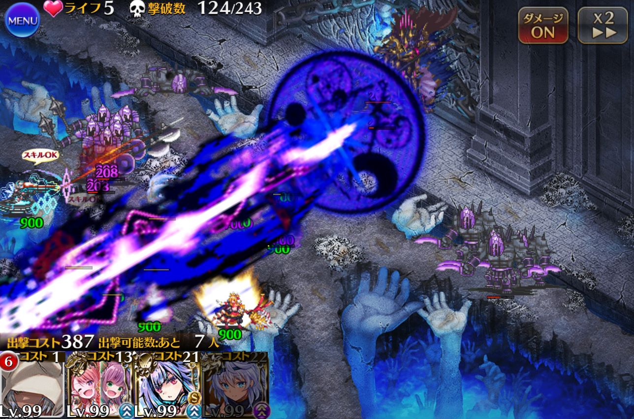 この槍は貫通属性ダメージですが、脆いユニットでなければ耐えられるかなって程度のダメージで、そこまで警戒する必要はありませんでした。エフトラのような高い瞬間火力で破壊してもOK。