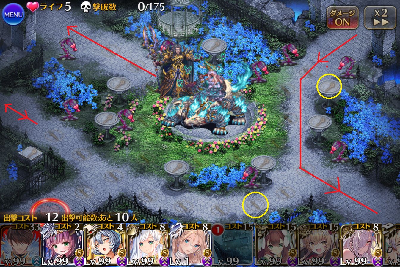 右下からのそのそと歩いてくる大きい骸骨が火力バカなうえにやたらとタフなので鈍足 or 暗殺ができるユニットを連れていくのがおすすめ。ブロックするとぬっころされます。