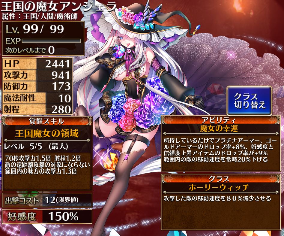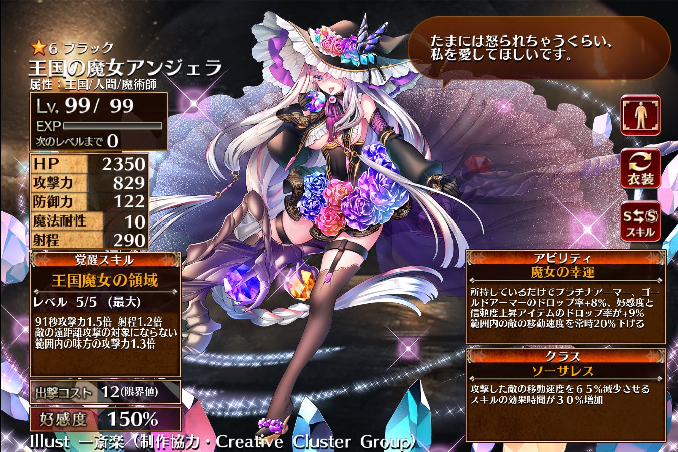 ユニットを所持しているだけで育成素材である各種アーマーと好感度アイテムのドロップ率が上昇する初心者にありがたいアビリティを持っています。上昇値は普通。ドロップ率がもっと上昇するユニットがいますが、アンジェラの数値も悪くはないです。