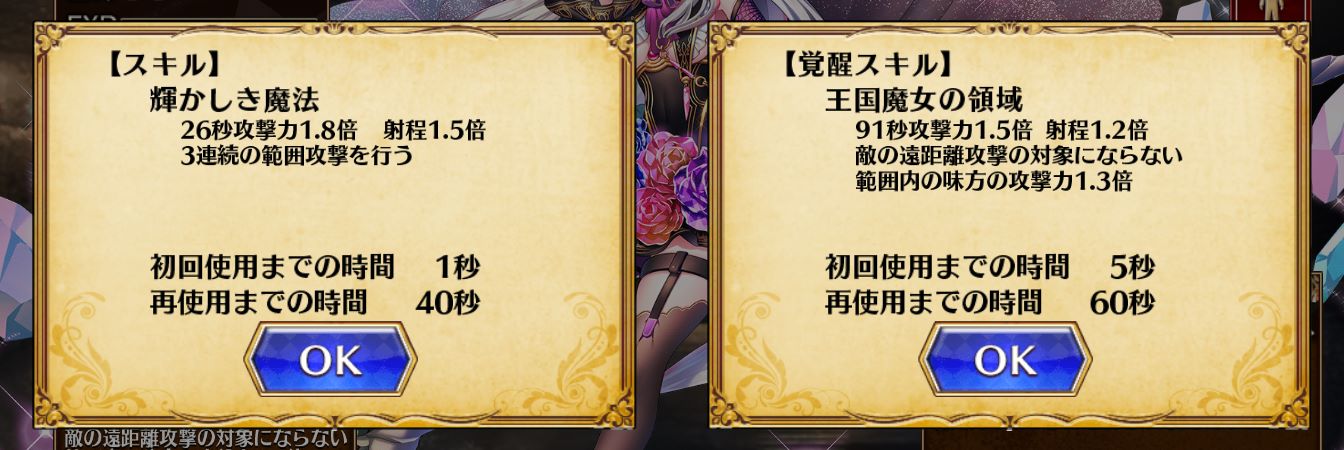 長時間、範囲バフを撒き続けられるのが強みのスキル。隠密が付いていることで前のめりに配置することができる点も偉い。範囲バフの倍率も1.3倍と標準値です。