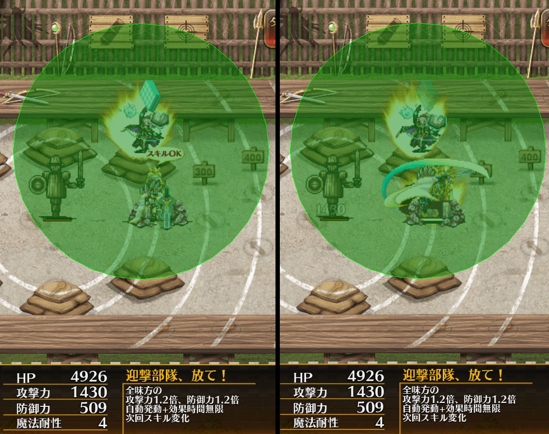 | 効果 | 全味方の攻撃力1.2倍、防御力1.2倍 次回スキル変化 |