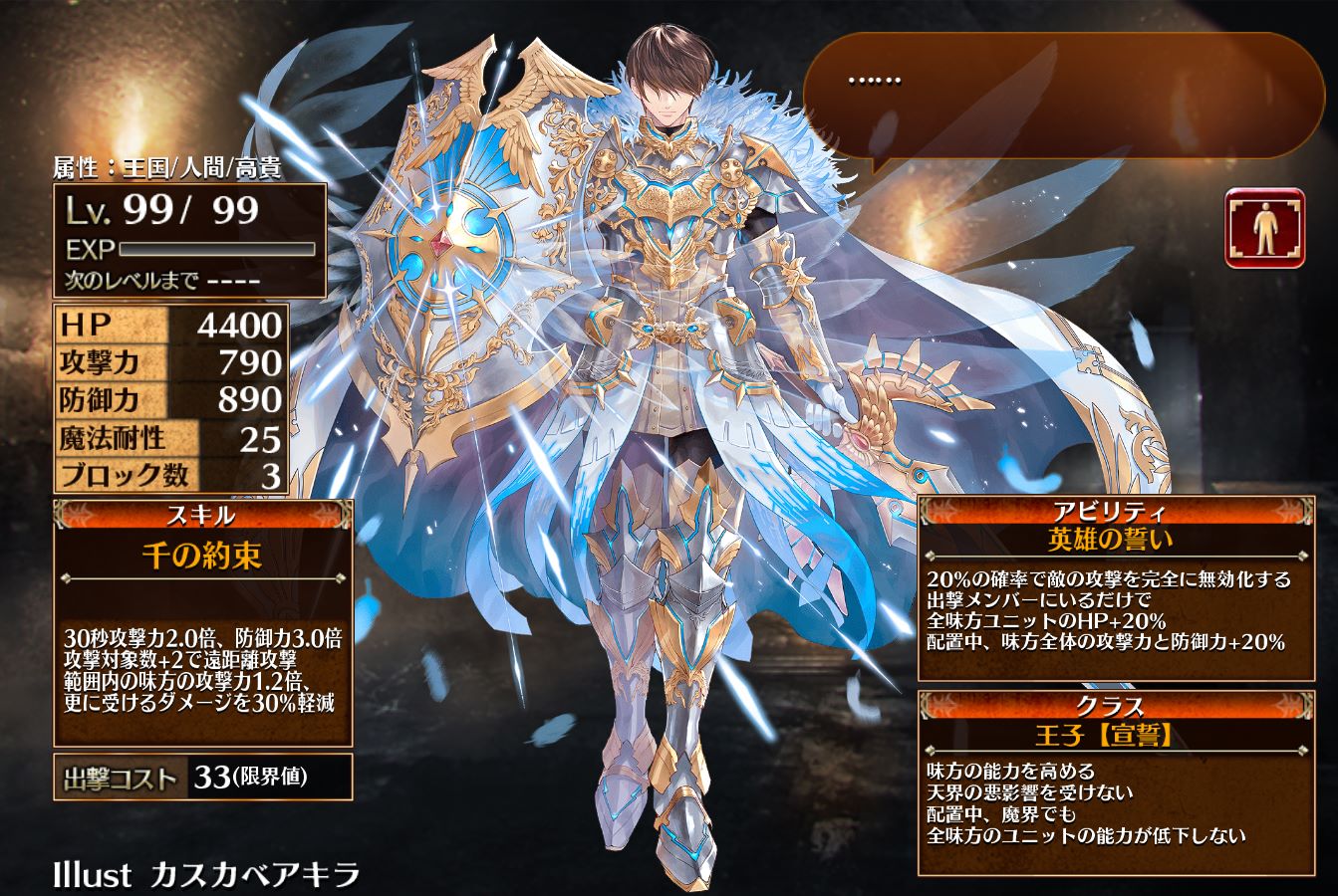 アビリティのバフ量は英雄王と同等。クラス特性で全味方の魔界の悪影響を無効化する能力を有しています。魔界ステージでの択が増えたのは良いことですが、コストが重たいですね。魔界でこそ早めに王子を置きたいんだ・・・!