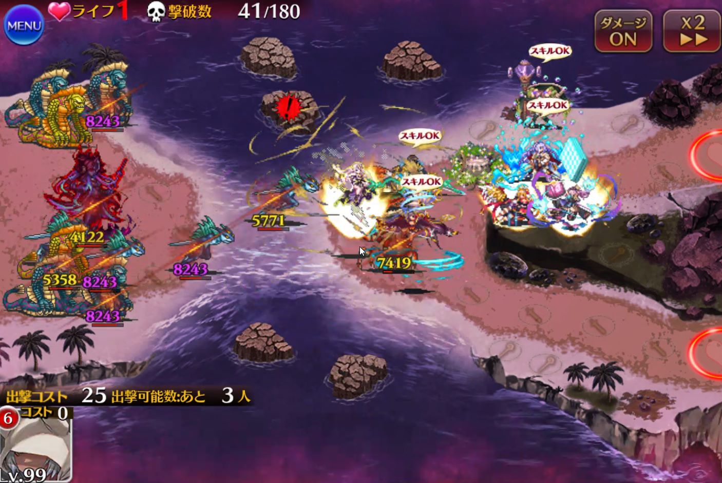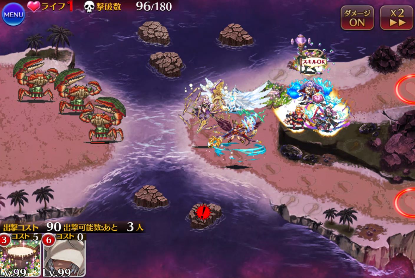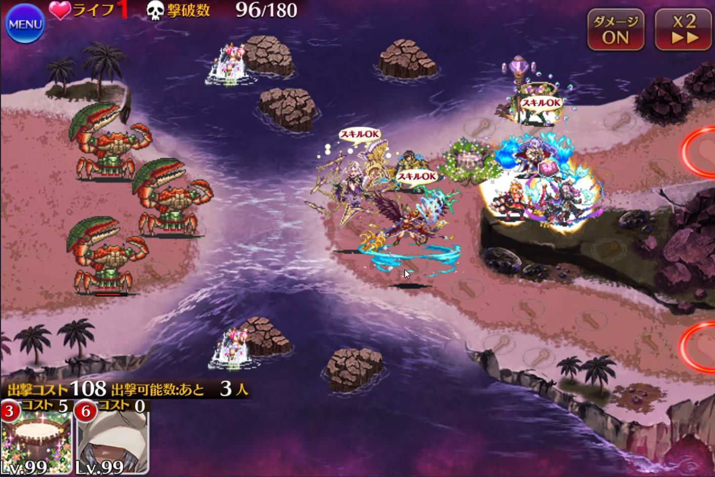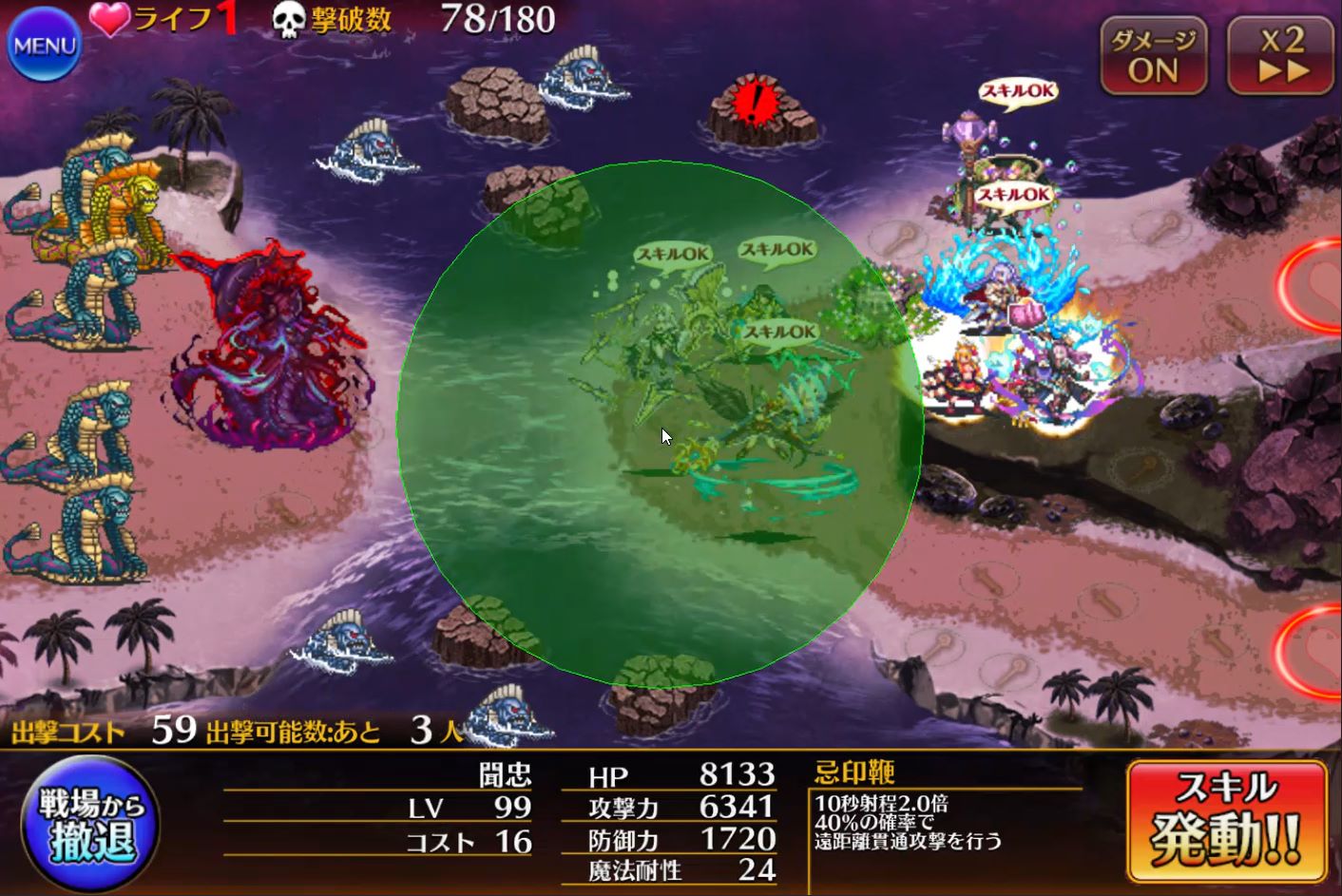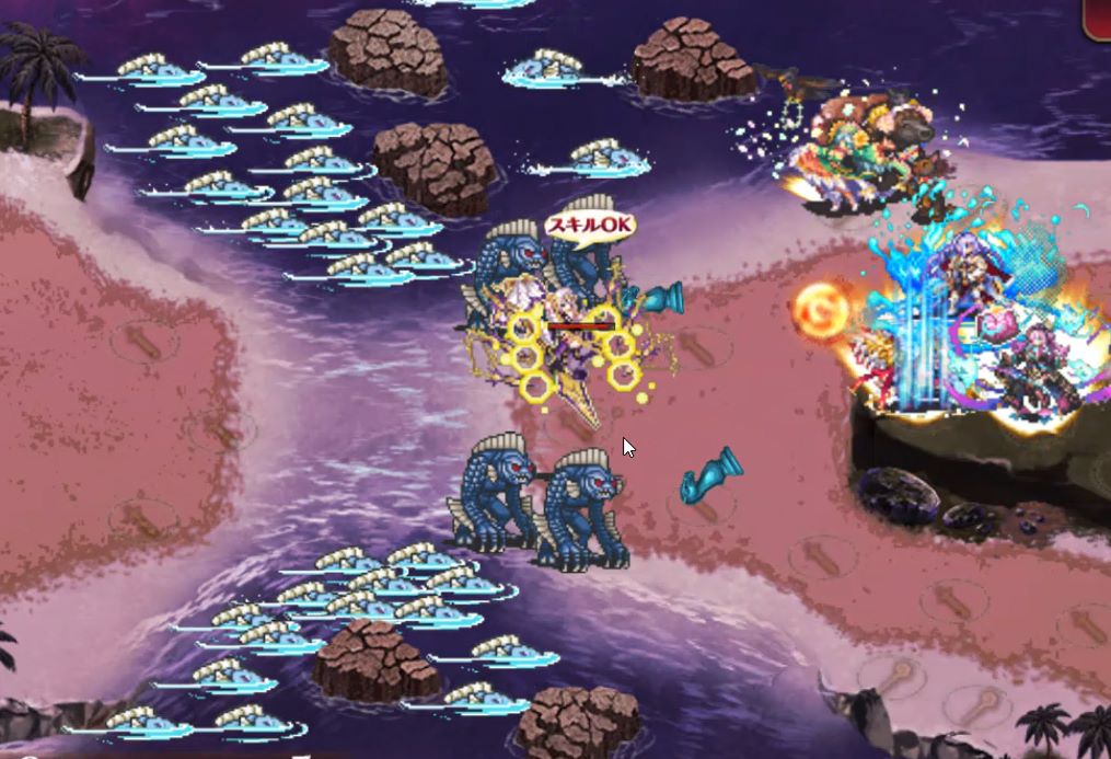 セイレーンが存在している間、味方ユニットの攻撃力-25%、敵の攻撃力+25%されます。さらにハープをポロンポロン鳴らすたびに画面全体攻撃が発生し、味方がゴリゴリに削られます。しかも時間が経つと岩場の数だけ増えていく。