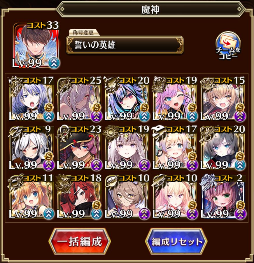 聞忠、エフトラ、イヴリールの三人のアタッカーを中心になんやかんやする構成です。超極級の編成と比べて最下段の4名が増えました。