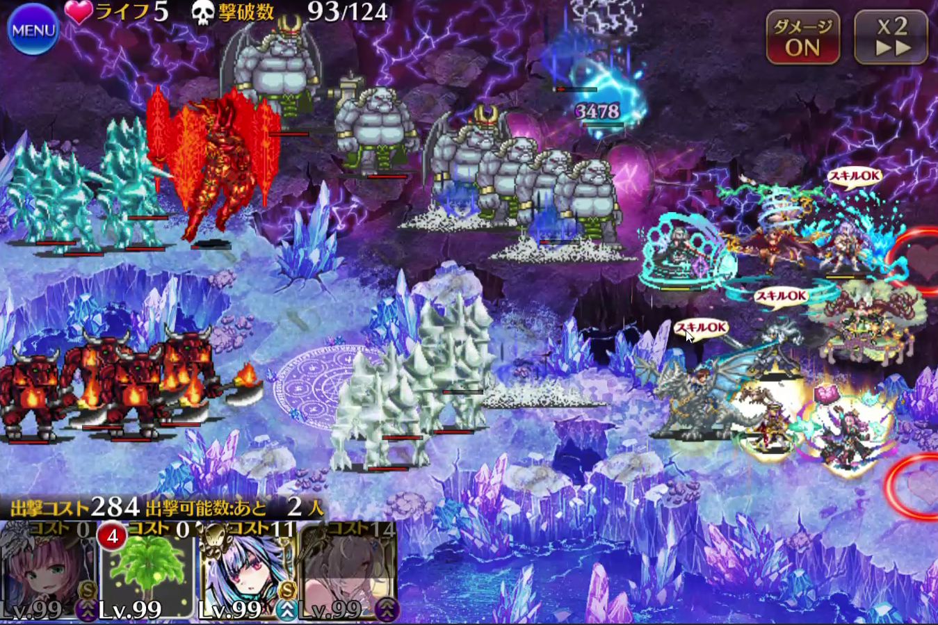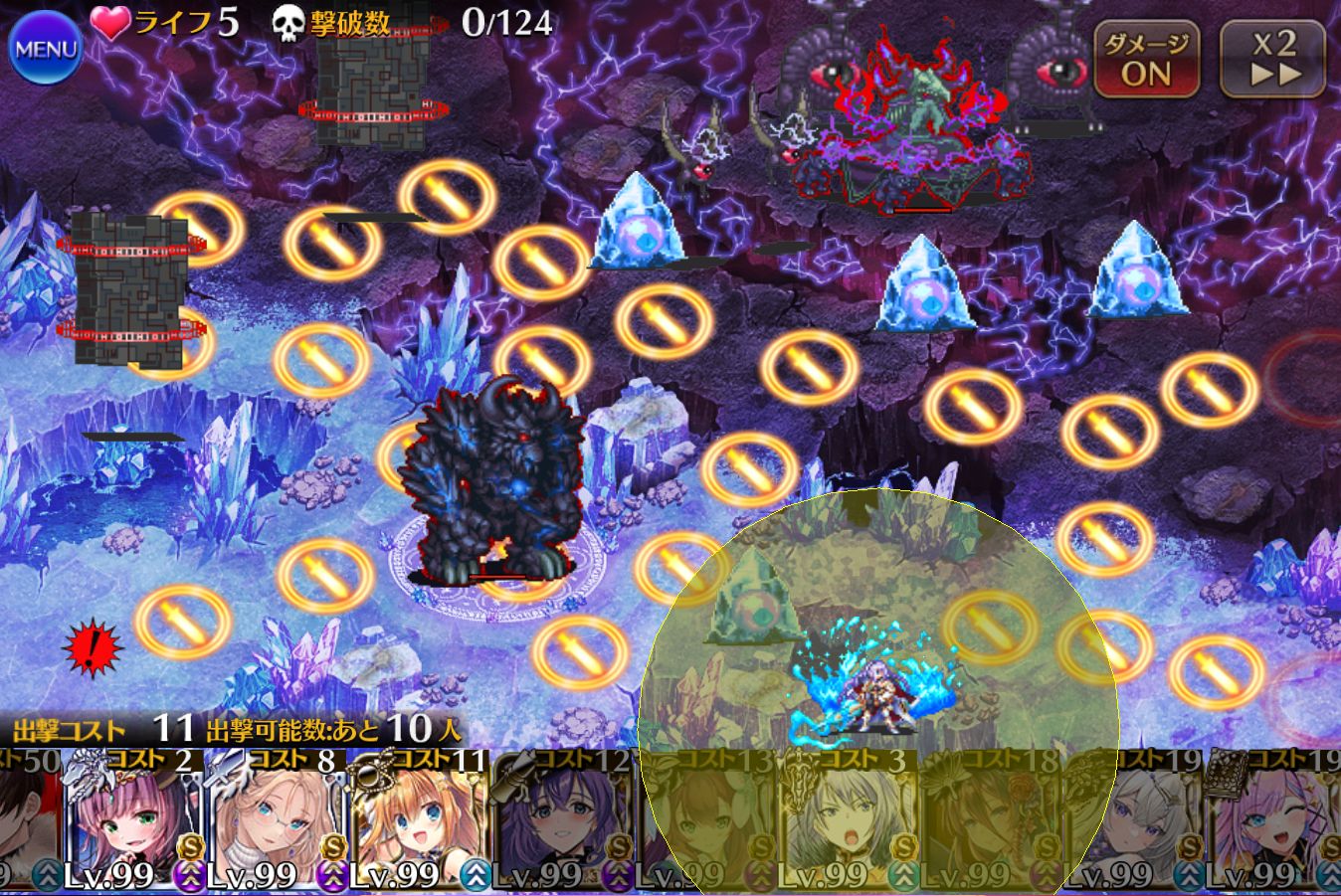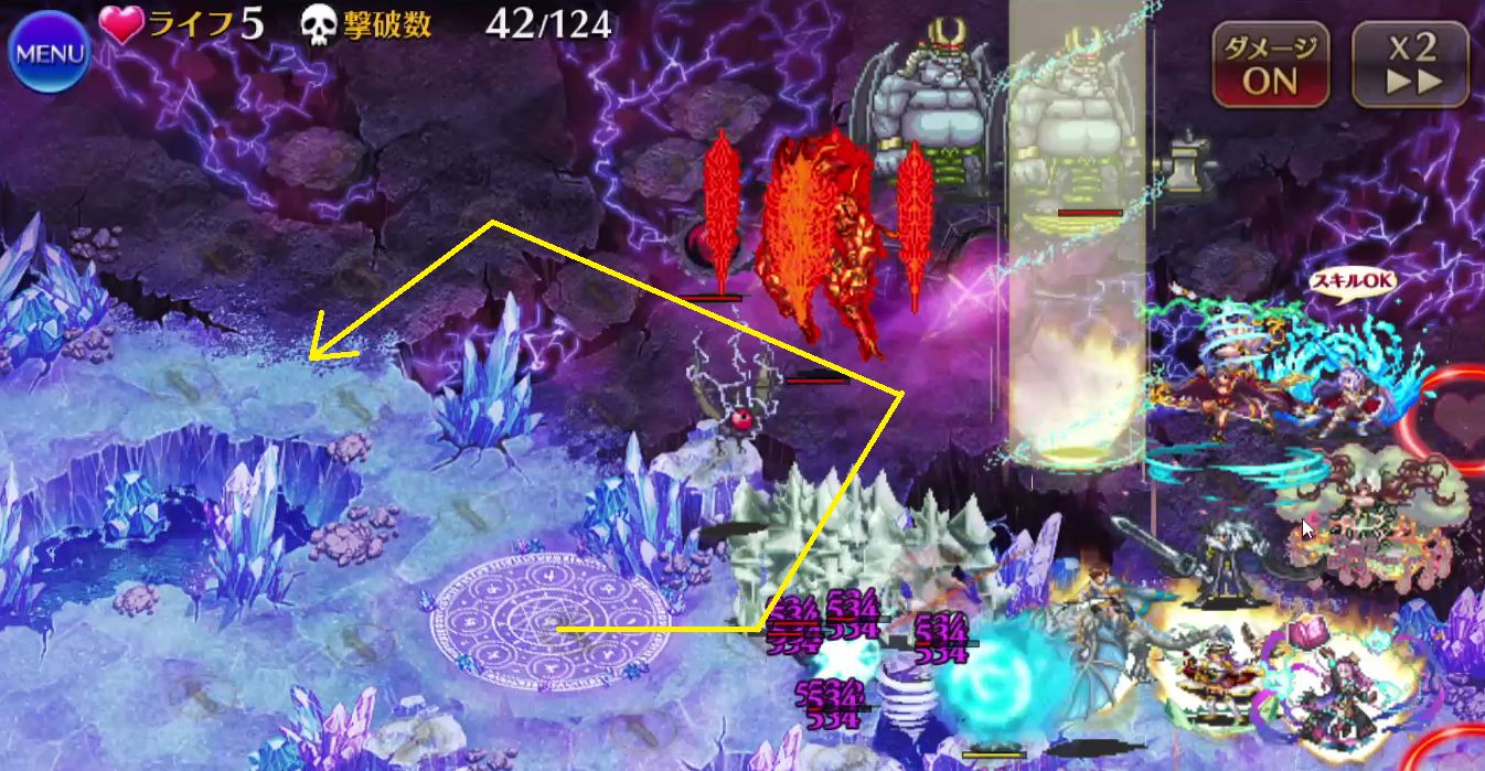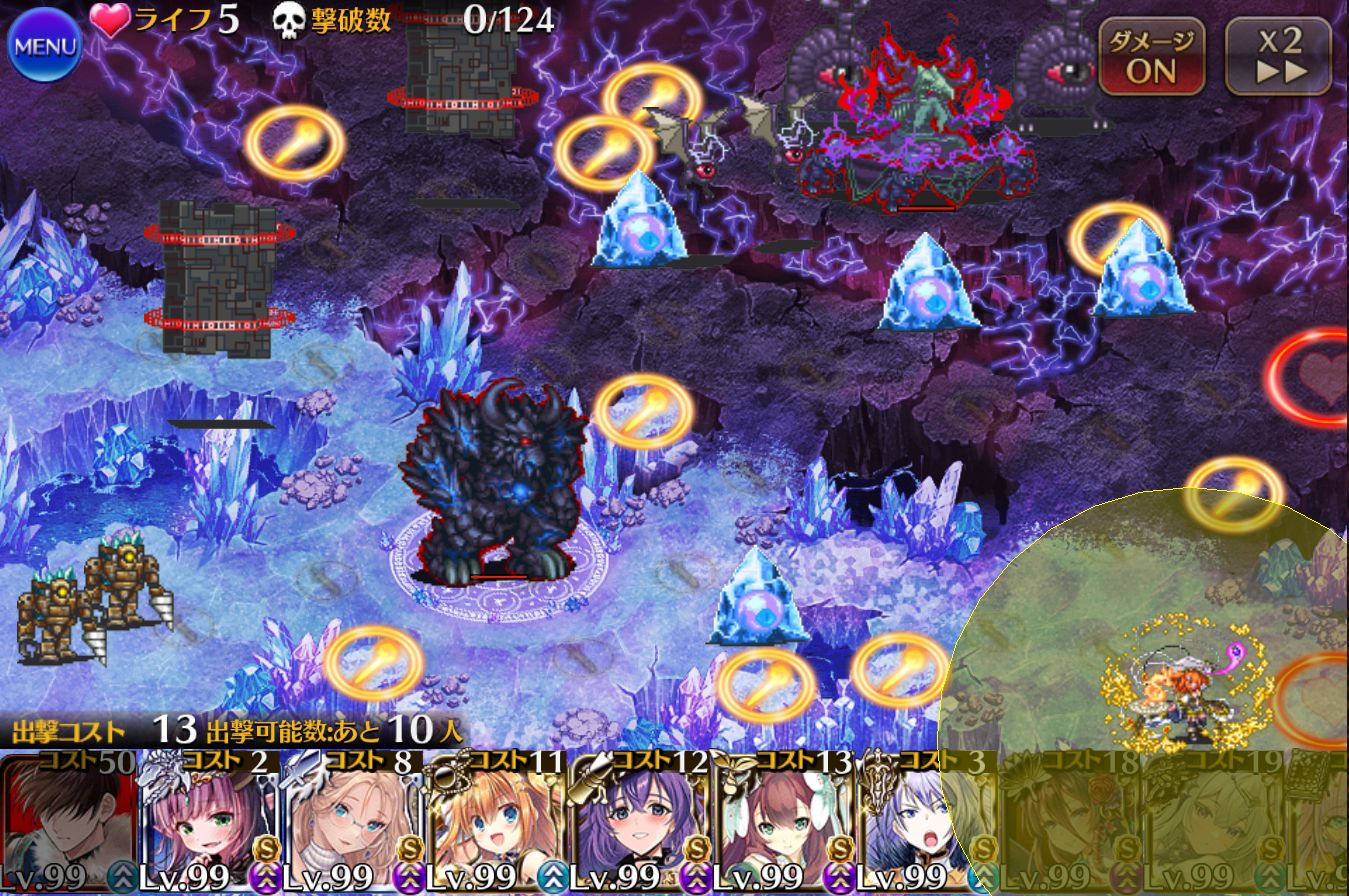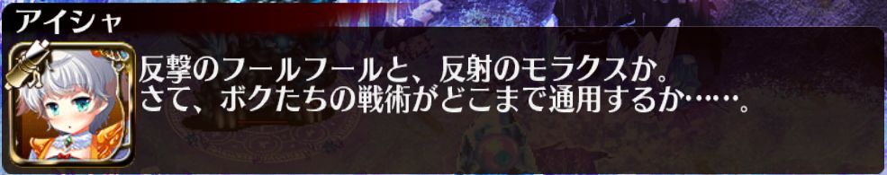 ボスに攻撃が当たるとダメージが返ってきてしまうので、だいたいは右半分に固めて配置することになりそうです。アイシャチャンのありがたいお言葉を置いておきます。