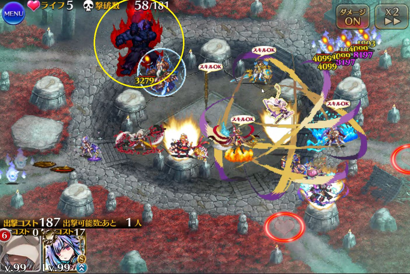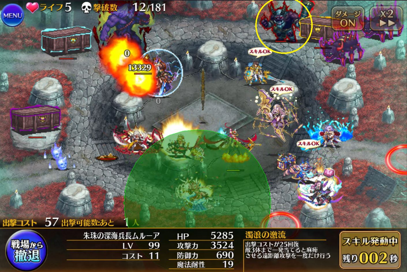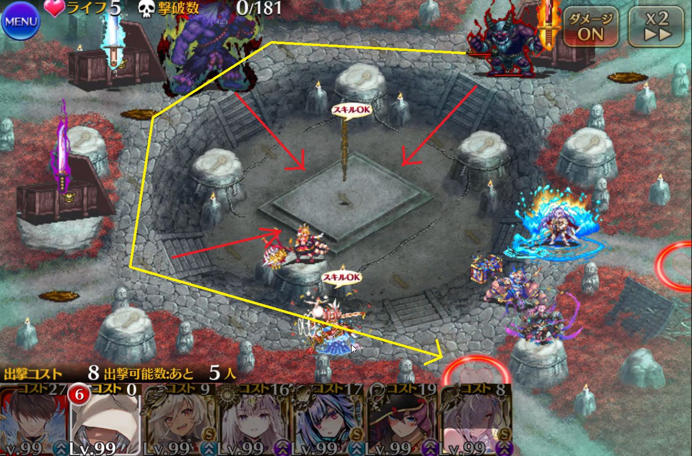 足の速い敵、遅い敵が入り混じっていることと、円状のマップになっているせいでタゲがブレまくることがあります。マルチターゲットか範囲内攻撃スキルを持つアタッカーがおすすめです。