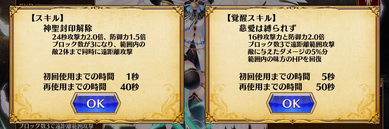 攻撃倍率は通常スキルと一緒ですが、こっちはマルチ攻撃が無い代わりに範囲攻撃となっています。与えたダメージ5%分のエリアヒールが付いていて戦線維持に役立ちそうです。持続時間が短く、CTが長いのが難点。