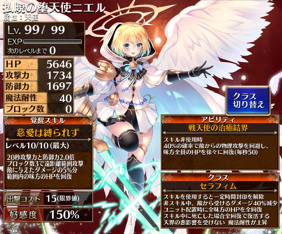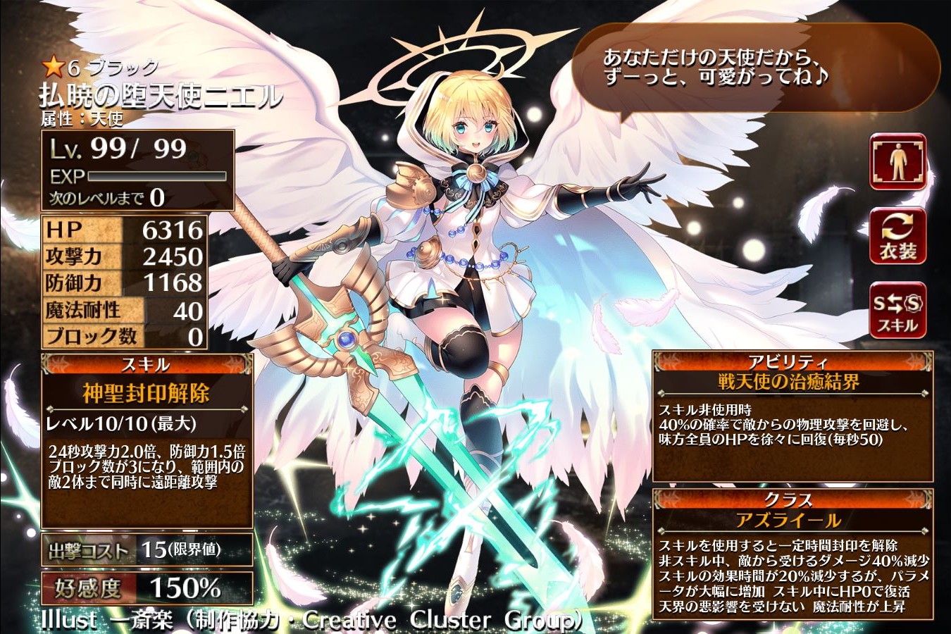 スキル未使用時に物理回避40%、受けるダメージを40%カットする避雷針性能お高めエンジェルです。おまけ程度の全体リジェネ(毎秒50)も付いていてお得!付いててお得なんです!ニエルは。