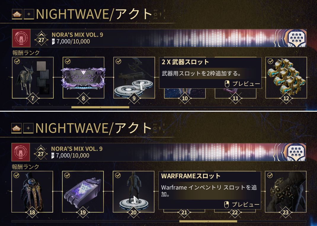 4ヶ月前後の周期で開催されているらしいNIGHTWAVEでは、Warframeスロットと武器スロットが配布されている。