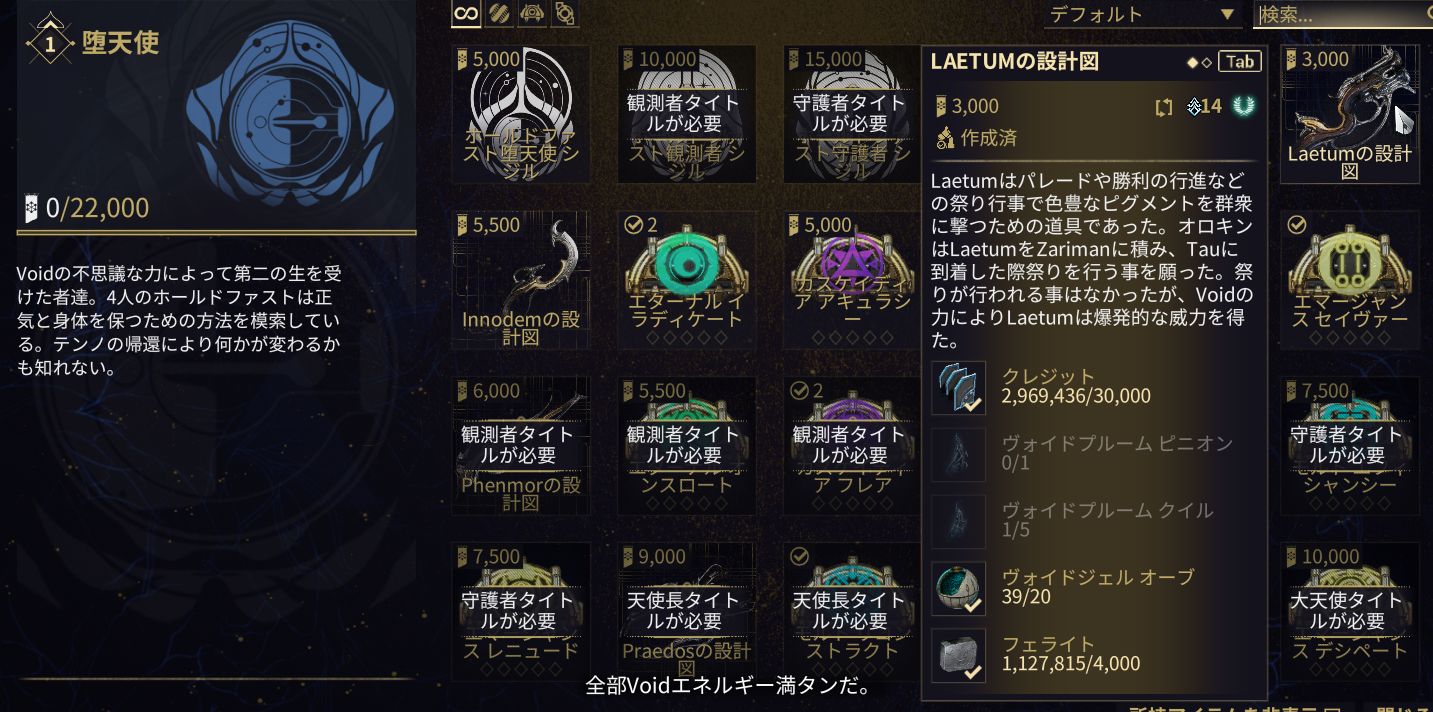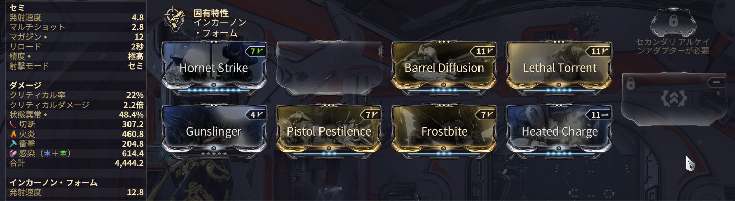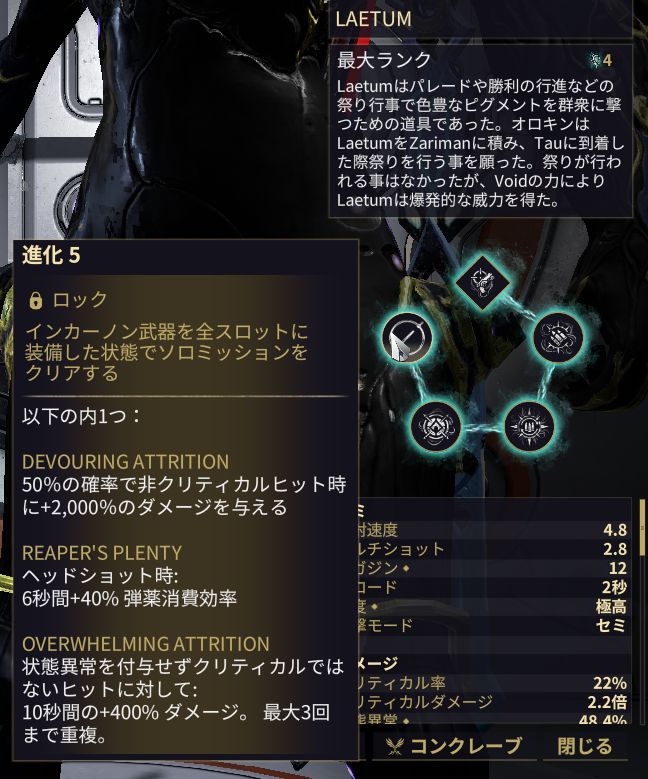 最終進化させるにはプライマリ、セカンダリ、近接にすべてインカーノン武器を装備する必要があります。その全てはZarimanのクリサリスにいるCavaleroが取り揃えている・・・のか?全部あるんだろうかここに。