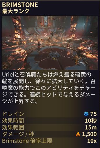| VYTHELAS | 倒した敵からルーンを集めることで発射速度と火炎ダメージボーナスを得る。![]() ▼影響を受けるステータス 発射速度 :アビリティ威力 追加ダメージ:アビリティ威力 バフ持続時間:アビリティ効果時間 |