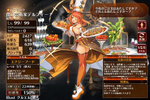 おすすめに掲載中のユニット。Fooooooooooooooooooooooooooooooo!ついに遠距離用の料理人が実装されてしまいましたね。オーガスタが起こした革命を今一度見せてくれるかデルフィーナ。ステータス王子と自分、そして遠距離ユ...