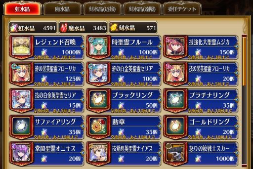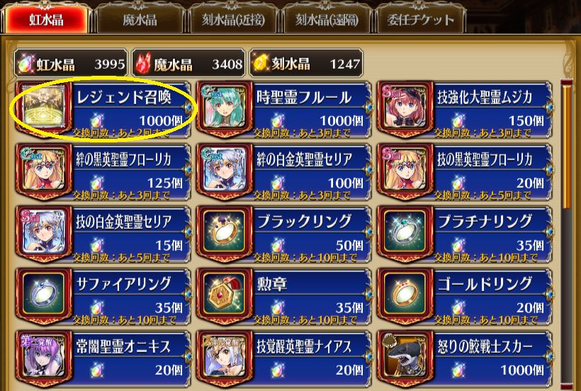 虹水晶・レジェンド召喚 殿堂入りシステムが実装されて「各種リング」の価値が上がりました。余裕があれば「英傑用の聖霊」もここで補充しておくと英傑結晶を他に回せます。魔水晶・ブラックリング 10(400)・プラチナリング 10(250)・ゴール...