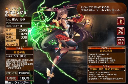 ステータス好感度100好感度150HP+450攻撃力+180-アビリティとクラス特性が攻撃力に極振りって感じです。反面、守りはかなり脆いですね。HPも防御力も低く、魔法耐性も0なので敵を抱えたくない感じが対魔忍卍って感じ。遠近両方のマスに配...